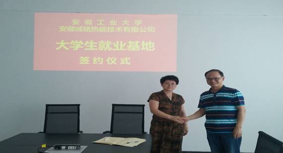 8月18日,安徽工业大学金沙集团wwW3354CC与安徽诚铭热能技术有限公司签订产学研合作暨大学生就业基地合作协议。金沙集团wwW3354CC院长陈光、党委副书记谢文平、安徽诚铭热能技术有限公司总经理薛华飞以及学院师生代表、企业员工代表共同参加活动。