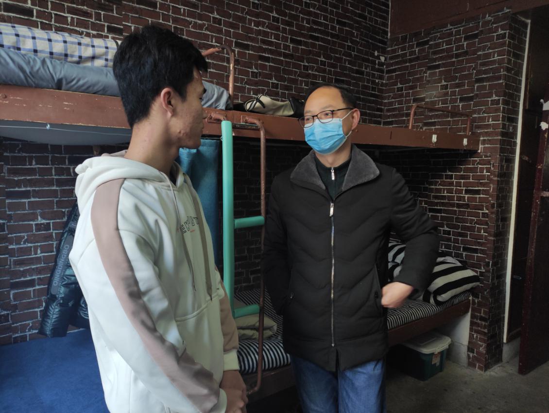在学生宿舍,谢文平详细了解了该生的学习和生活状况,叮嘱他留校期间要积极配合学校疫情防控工作,保持乐观心态,做好个人防护,多和家人联系,合理安排好学习生活。