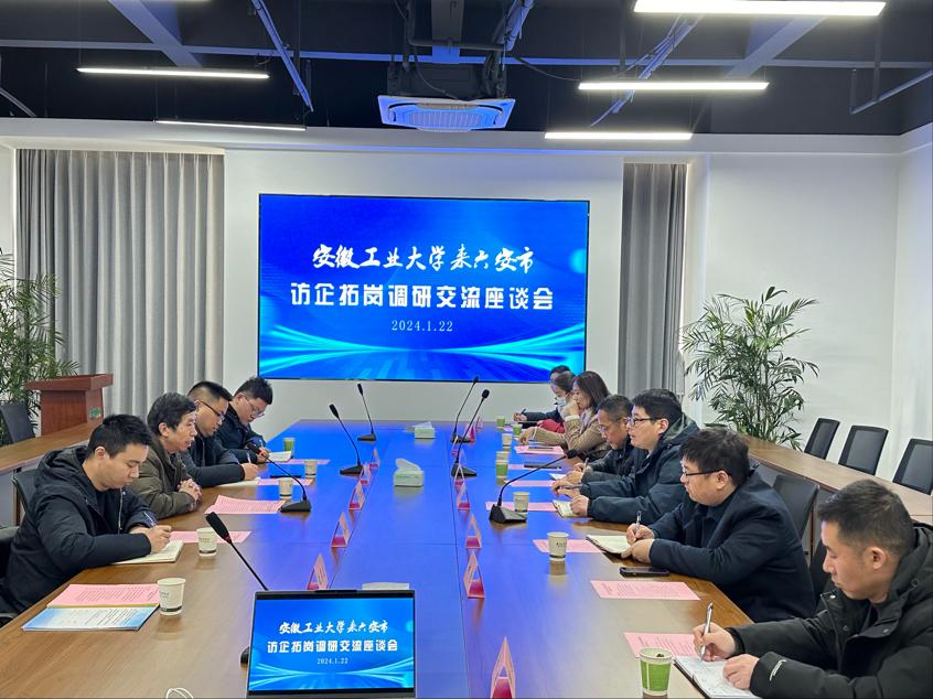 1月22日下午,水恒福一行与六安市人社局、多家制造企业开展访企拓岗调研交流座谈会。六安市人力资源和社会保障局副局长李小天对安工大一行的到来表示热烈的欢迎。座谈会上,水恒福介绍了我校的历史沿革、师资力量、办学条件、学科建设等情况,希望借助校企产学研合作机会,政校企协同育人、共谋高质量发展。参加座谈会的企业代表纷纷表达了企业转型、新材料研发、突破相关技术瓶颈以及特殊人才等方面的需求,期待进一步加强与安徽工业大学的产学研合作交流。