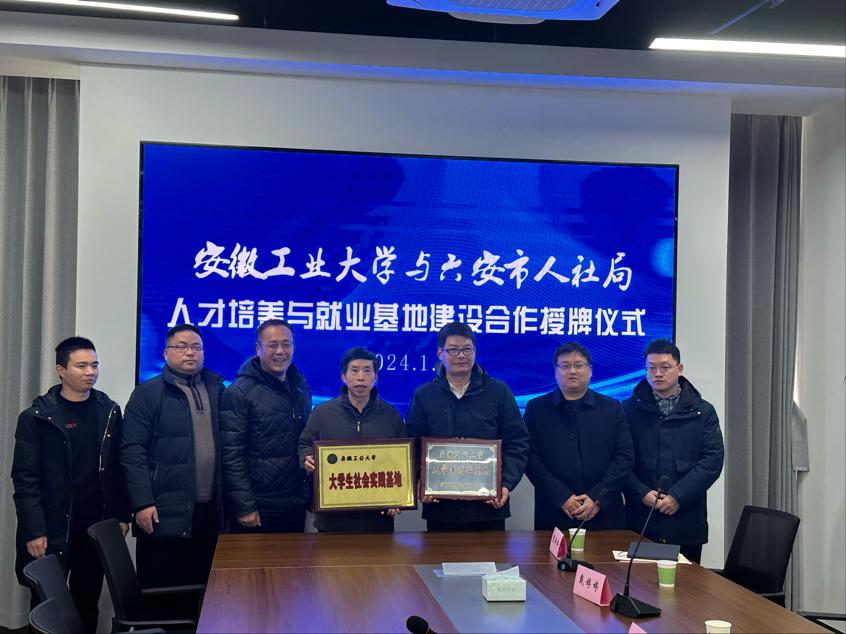 水恒福代表学校与六安市人社局及相关企业达成友好合作关系并签订就业基地建设合作相关协议。双方共同为六安市人社局的安工大“大学生就业基地”和“大学生社会实践基地”揭牌。