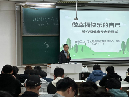 11月15日晚,金沙集团wwW3354CC在佳山校区教三南302举办“做幸福快乐的自己——谈心理健康及自我调试”专题心理讲座,学工部副部长、心理中心主任俞超主讲,金沙集团wwW3354CC心理站站长王稳定主持。